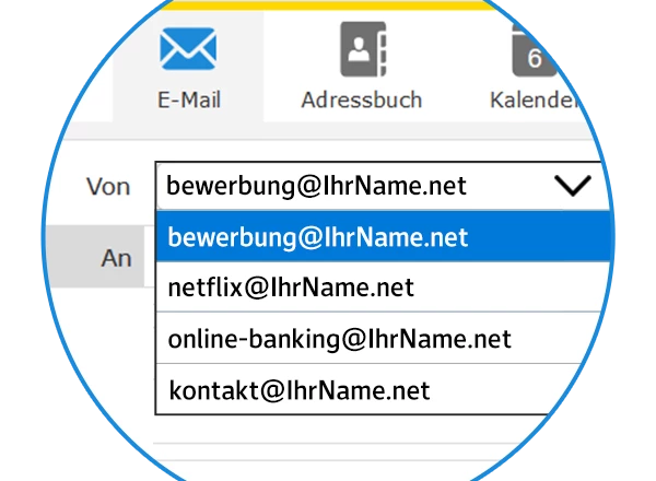 Versorgen Sie Ihre Familie, Ihren Verein oder Ihre Firma mit personalisierten E-Mail-Adressen. Sie können diese auch beliebig auf bereits bestehende E-Mail-Adressen weiterleiten!